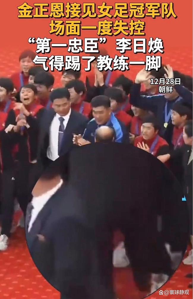 李日焕曾被金正日誉为“第一忠臣”,此次失态是因为现场秩序失控。当天,女足队员和教练见到金正恩后情绪激动,纷纷蜂拥上前围堵,试图近距离表达敬意,打乱了原本的接见流程,导致安保团队急忙上前疏导解围。被激怒的李日焕径直走向主教练朴颂金,抬腿踢向对方,疑似责备其未能约束队伍纪律。