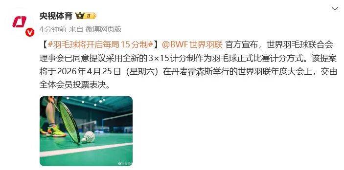 5、据@央视体育12日消息,世界羽联官方宣布,世界羽毛球联合会理事会已同意提议采用全新的3×15计分制作为羽毛球正式比赛计分方式。