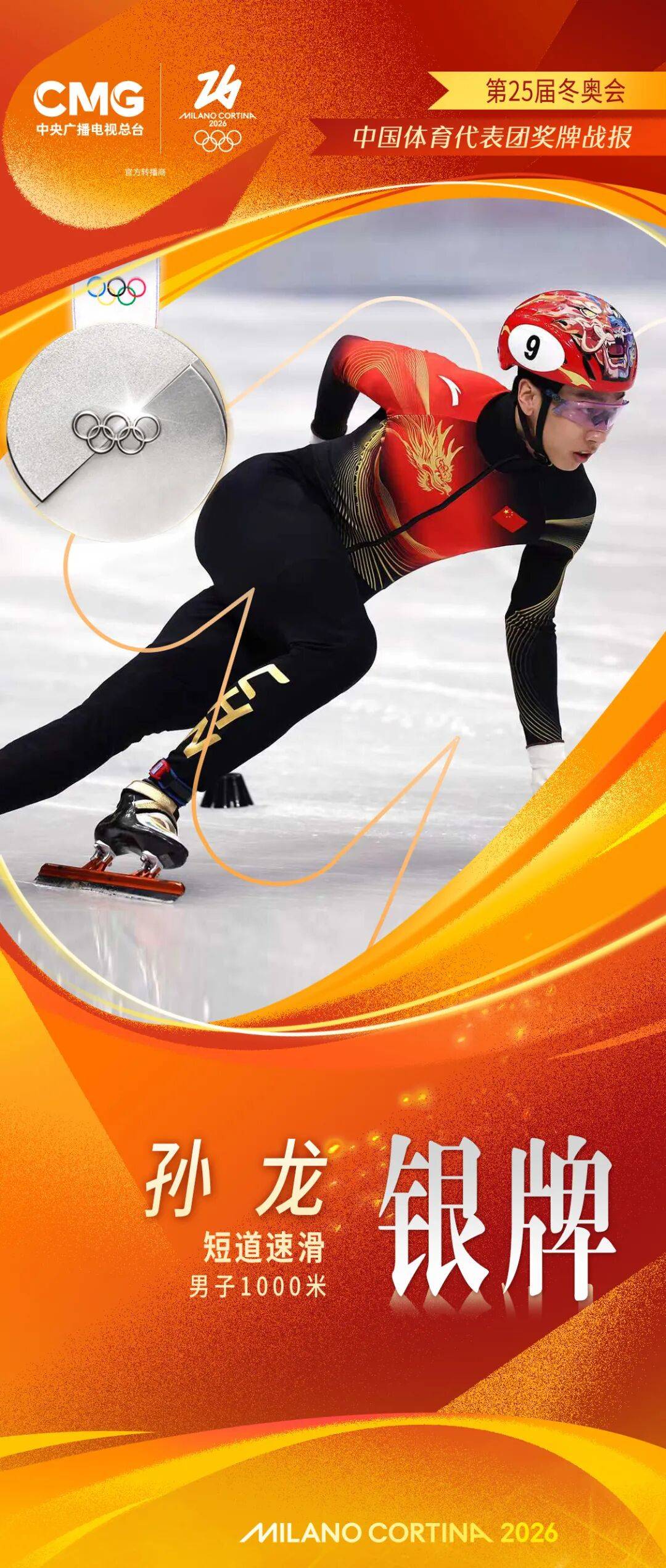 北京时间2月13日,米兰-科尔蒂纳冬奥会短道速滑男子1000米决赛,中国选手孙龙夺得银牌!