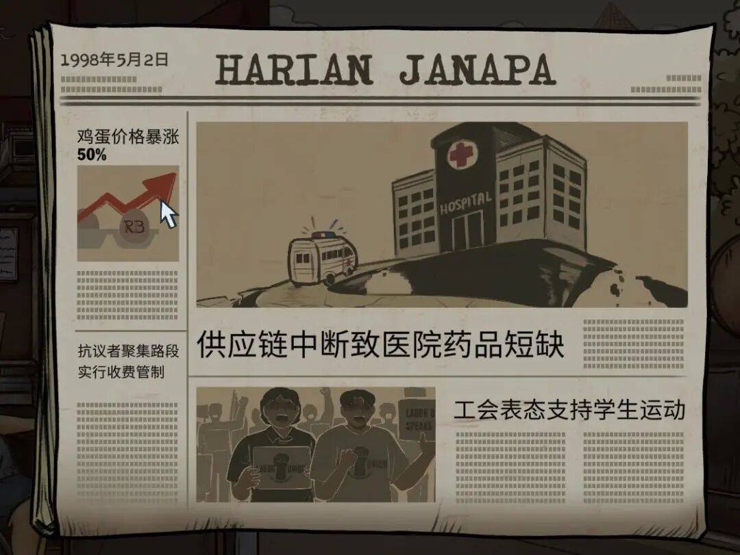 游戏中,鸡蛋价格暴涨的信息并不夸张,现实里,印尼1998年的大米价格相较上一年确确实实地上涨了50%。原本一个三口之家一个月的生活开支,在当时只能维持半个月。一时间中产返贫,底层则愈发艰难度日。