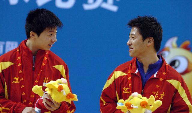 2005年10月17日,季军北京队组合马龙(左)/高伟在第十届全国运动会乒乓球男子双打颁奖仪式上。 新华社记者 杨俊江 摄