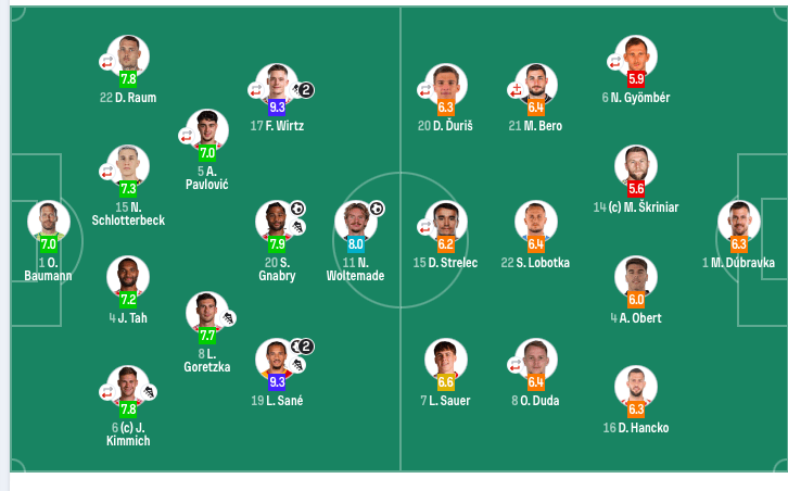 德国首发:1-鲍曼、6-基米希(63’23-巴库)、4-若纳坦·塔、15-施洛特贝克(63’2-佳夫)、22-劳姆(72’18-N·布朗)、5-帕夫洛维奇(46’13-恩梅查)、8-格雷茨卡、19-萨内、20-格纳布里、17-维尔茨(77’9-韦德拉奥果)、11-沃尔特马德。