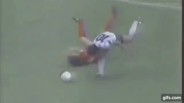 我看着韩国队使尽一切粗野肮脏的手段——我们都很熟悉韩国队那操行——对马拉多纳全身招呼,马拉多纳倒了无数次;但每一次都是,只要还有可能站起来,他就会拼命地站起来向前。