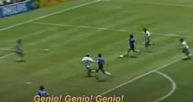 “马拉多纳拿球!两个人在缠他。马拉多纳触球,足球天才向右冲刺,摆脱第三个人,要给布鲁查加了!还是马拉多纳带球!天才!天才!!天才!!!哒哒哒哒哒哒!进球!!!!!!进球!!!!!!!!!我要哭了!!!!亲爱的上帝!足球万岁!!!!进球!!!!!迭戈进球!马拉多纳!这足以让我流泪了,原谅我!!马拉多纳,一个让人无法忘却的奔袭!历史级的演出!你是哪个星球来的呢?来唤醒那么多英国人?来让整个国家为阿根廷挥手庆祝?!阿根廷2比0英格兰!迭戈!迭戈!迭戈·阿曼多·马拉多纳!谢谢上帝!为了足球!!为了马拉多纳!为这一切的眼泪!!!阿根廷2比0英格兰!!!”